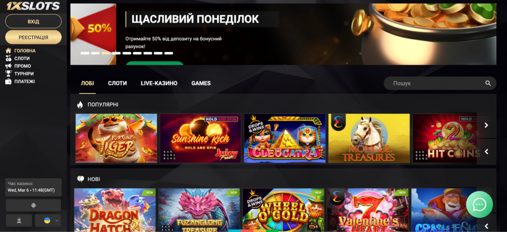 1xSlots предлагает более 5700 игровых автоматов от 80 провайдеров – такой выбор редко встретишь в других казино. Минимальный депозит – всего 20 гривен через Piastrix. Максимальный бонус – 1500€.