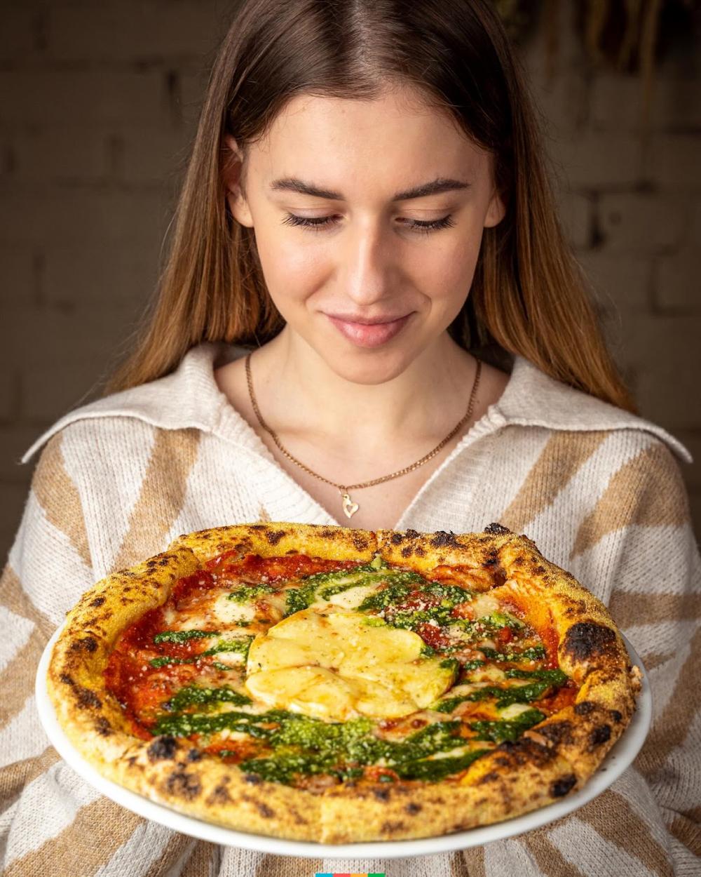 Настоящая итальянская пицца из дровяной печи, изготовленная на цельнозерновом тесте, с тонким тестом и хрустящими краями. Это пицца с помидорным соусом с базиликом, орегано и чесноком.