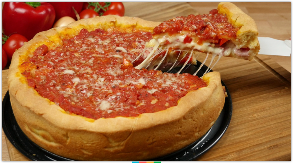 Ця піца, відома також як піца по-чиказьки або піца на глибокій сковороді, на перший погляд більше схожа на пиріг.