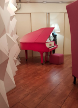 Первое, что бросается в глаза - гламурный интерьер в бело-розовых тонах. Очень стильно! Розовые мягкие стулья, розовый рояль, большое зеркало при входе (важно для девушек и любителей selfie), фотографии людей на стенах. В общем, очень интересно и по стилю. Это +