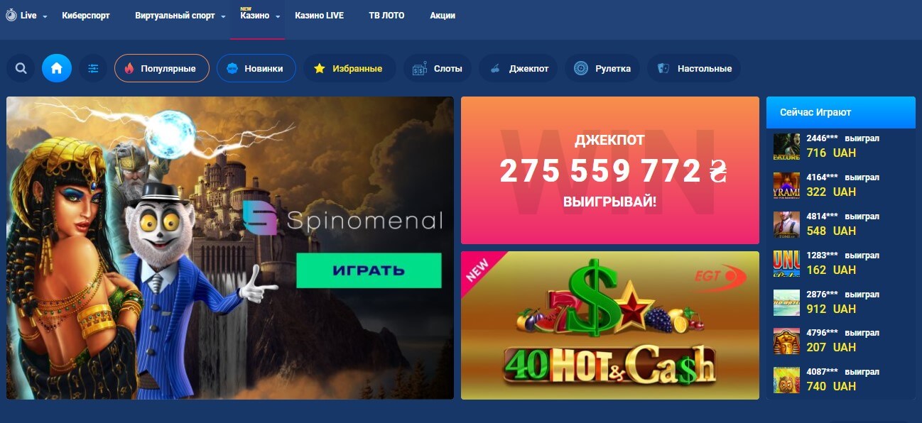 Игроки сразу же стают перед выбором, чему отдать предпочтение в букмекерской конторе Фаворит: игровым автоматам, спортивным ставкам, либо же выбрать live казино. Пользователи видят навигационную панель, в которую входят развлечения, акции и размер джек-пота. Также хорошо прослеживается клавиша входа и регистрации.